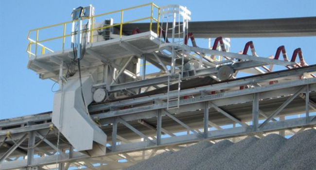 The system consists of a movable tripper unit mounted on a belt conveyor. This tripper travels along rails or tracks installed parallel to the conveyor structure. Its primary function is to discharge material from the conveyor belt at multiple points along its length, enabling effective stockpiling or bin filling.